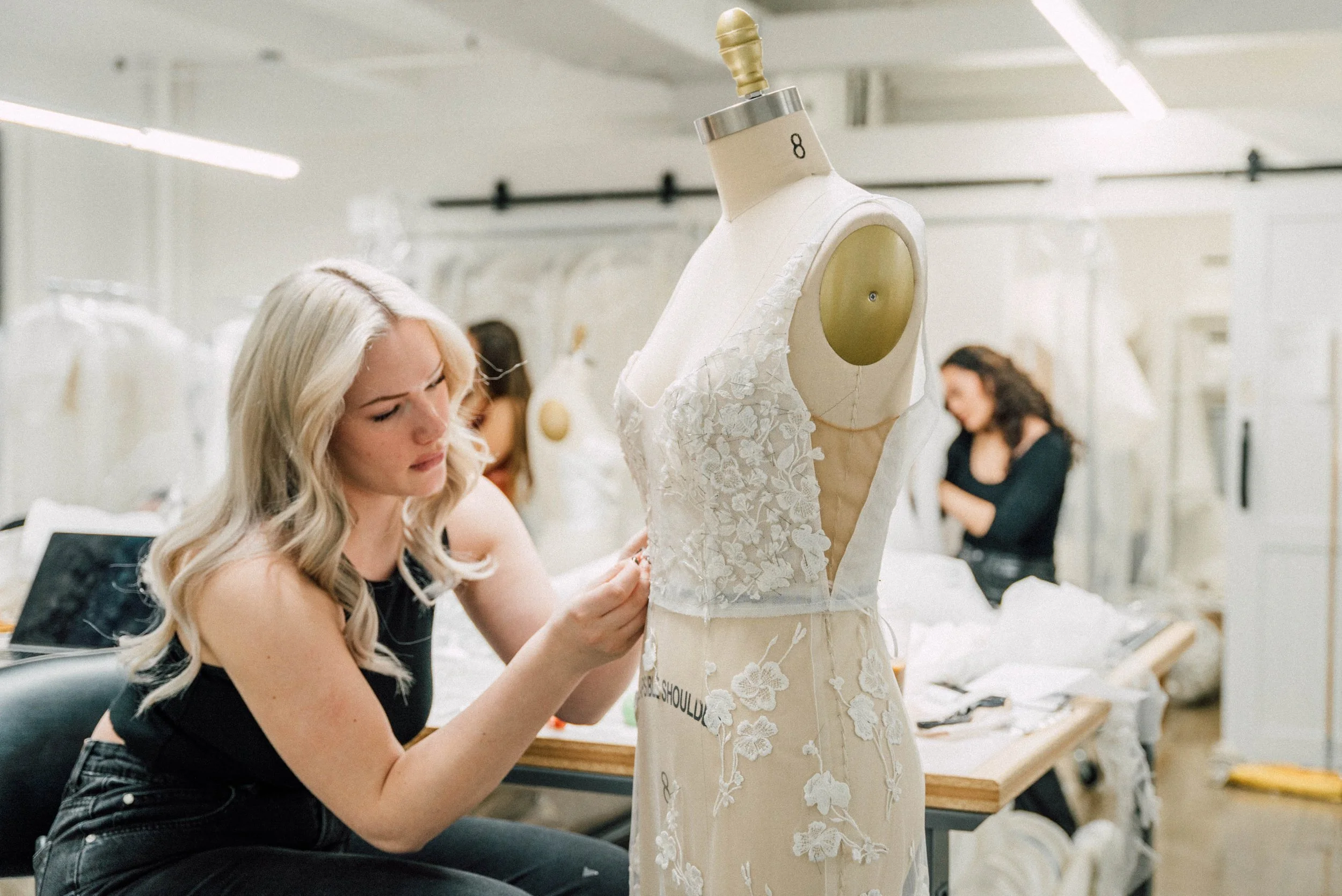 Raised in Ohio, Rainey Blantern knew at 10 years old that a career in bridal design was her calling. Starting with sewing lessons at age 11, Rainey has continued to actively look for opportunities to learn new skills. Eventually, Rainey enrolled in one of the top- ranking fashion schools in the country, Kent State University, where she graduated with a Bachelor of Arts in Fashion Design with minors in Entrepreneurship and Sustainability. She also completed a course at the Fashion Institute of Technology in Natural Fibers and Dyes, and these skills are prominent within every collection she produces.